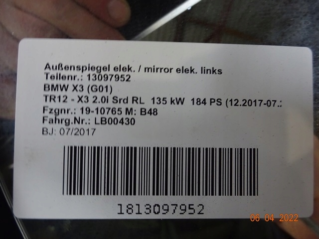 RETROVISOR IZQ. DER. BMW X3 G01 6 PIN KOLOR ($)