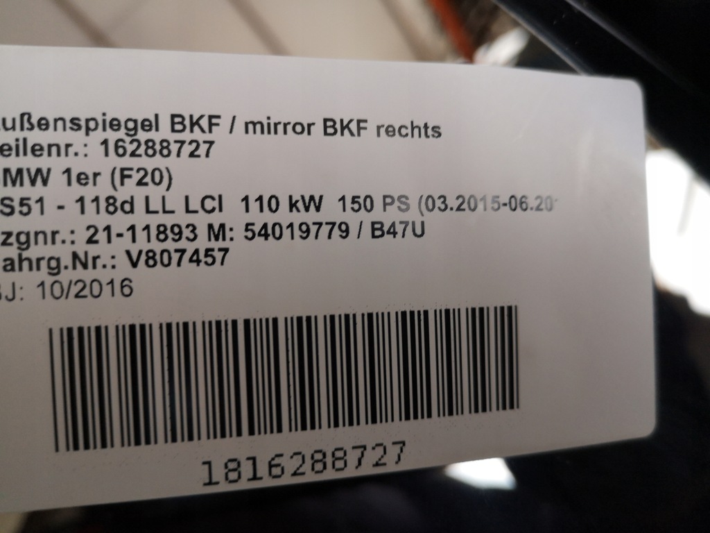 RETROVISOR DER. BMW F20 5 PIN 475 EUROPA ($)